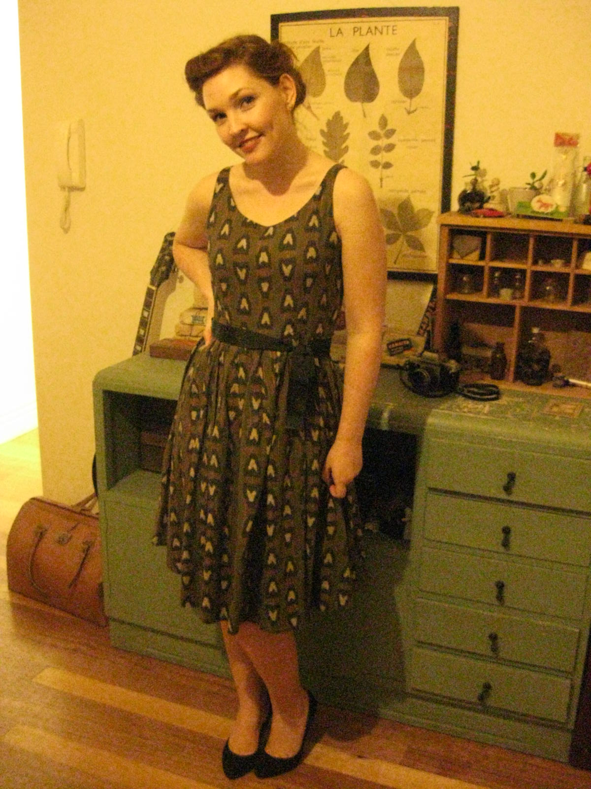 It's a really nice fabric, with a full circle skirt. I wore it with a black wool cardigan that I found at an op shop and shortened. No one makes nice cropped cardigans anymore! It's easy enough to do - just cut off the waist band and cut a section out of your sweater, then reattach the waistband. Just be careful the buttonholes still line up!